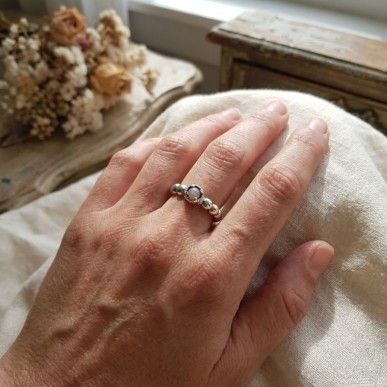 El Anillo Top Silver es una joya elegante y delicada, perfecta para el uso diario o para ocasiones especiales. Fabricado en plata de primera ley 925, presenta un diseño en forma de bolas de 4 mm de ancho con una piedra Calcedonia cabujón.