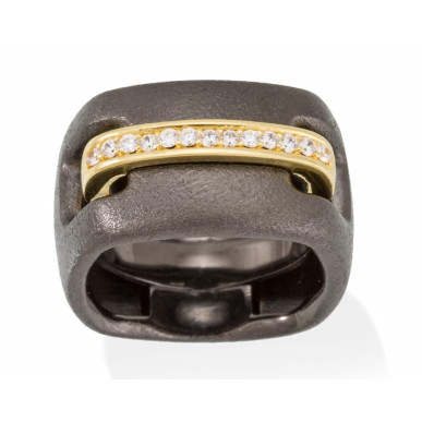 Anillo de plata de primera ley (925) con baño de rutenio y chapado en oro amarillo de 18kt con circonita blanca.Anillo de forma cuadrada y ajustable a la medida.