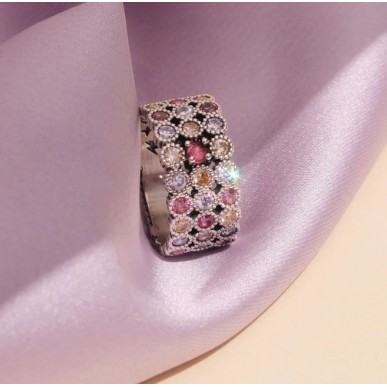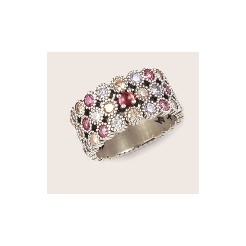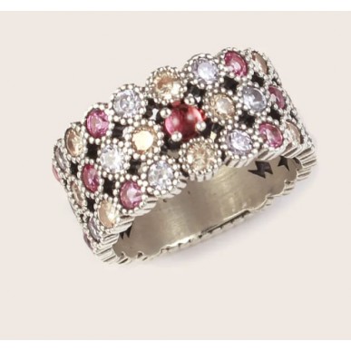 Anillo para mujer en plata de 1ª ley 925mls de la colección JOVIAN 35 de Xavier del Cerro , Piedra cabujón central en cuarzo color rubi y brazo en varios colores ancho del brazo 10,50mm . Talla 16 Tatum.