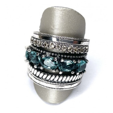 Anillo para mujer en plata de 1ª ley 925 mls de la marca Top Silver, Anillo Ancho Plata con Piedras Ovales Centrales en color azul. y una tira de piedras xampagne en un lateral