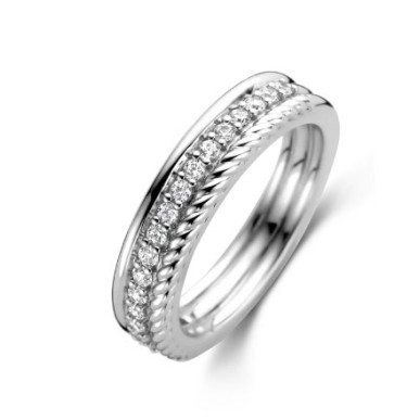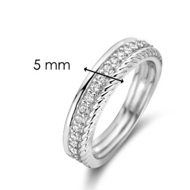 Este anillo de plata TI SENTO - Milano 12282ZI presenta tres bandas apiladas juntas en una. La banda central tiene una fila de piedras de circonitas cúbicas blancas. Una de las otras bandas tiene una estructura retorcida refinada y la otra tiene un mango plateado liso. El anillo está elaborado en plata de ley 925 y recubierto con una gruesa capa de rodio para protegerlo y mantener su luminosidad. Use esta pieza sola o juegue apilándola con otros anillos.