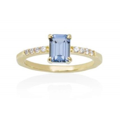 Anillo de plata de primera ley (925) chapada en oro amarillo de 18kt con circonita blanca y piedra sintetica color azul.