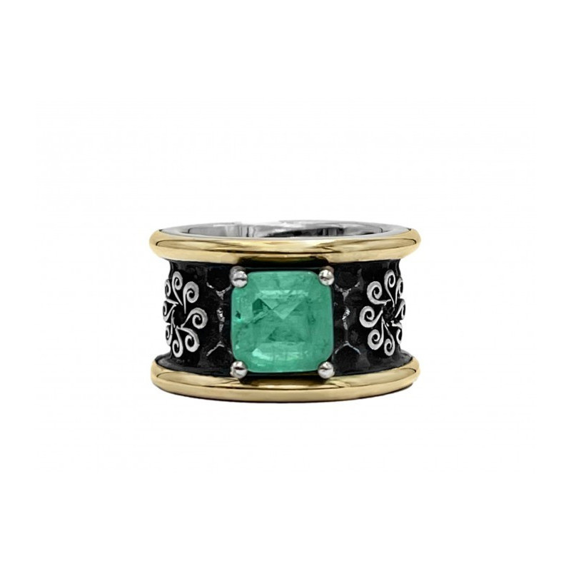 Sortija Plata 925/000 y oro laminado de 18K y Doblete Cuarzo Esmeralda. Este anillo ha sido diseñado por Antonio Espaliú y está elaborado artesanamente en nuestros talleres de Córdoba.