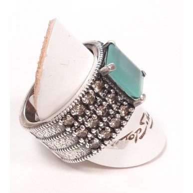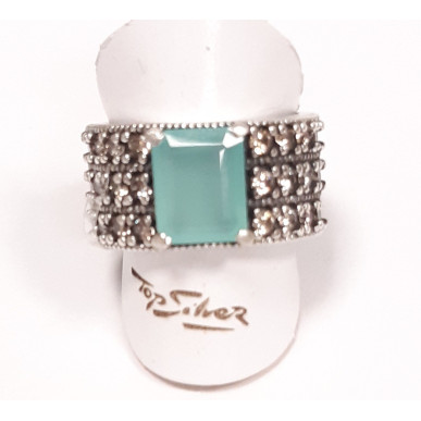 Anillo para mujer en plata de 1ª ley 925 mls de la marca Top Silver, anillo tres tiras con piedras circonita de color y piedra verde rectangular central 10x8 mm