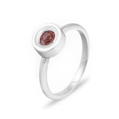 Anillo de cuerpo fino con pieza redonda y granate facetado en el centro. El granate favorece la seguridad y la firmeza de carácter. Hecho enteramente en plata con baño rodiado, es la joya ideal para llevar siempre, sola o acompañando otras piezas de la colección JOY.