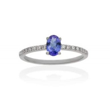 Anillo de Oro blanco de primera ley (750/1000) con 14 diamantes de peso total 0,11 qt. (Color: Top Wesselton (G) Pureza: SI) y 1 tanzanita natural en talla oval mixta 6x4 mm.