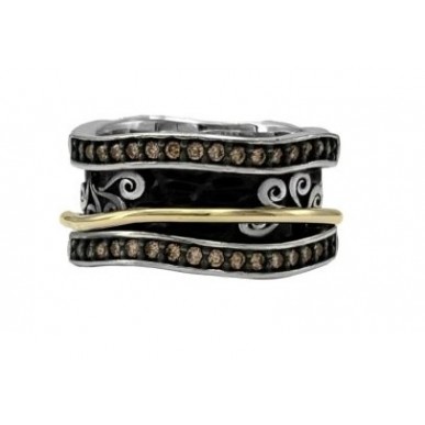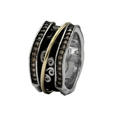 Este Anillo meditación BOHEMME SPIRIT III en plata y oro con circonitas champán está meticulosamente elaborado de plata rodiada y oro de 18K, combinando nuestro logo en rodio blanco que contrasta con los fondos oscuros de la plata oxidada y el aro giratorio en oro amarillo que aporta dinamismo y movimiento al diseño de la pieza.