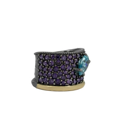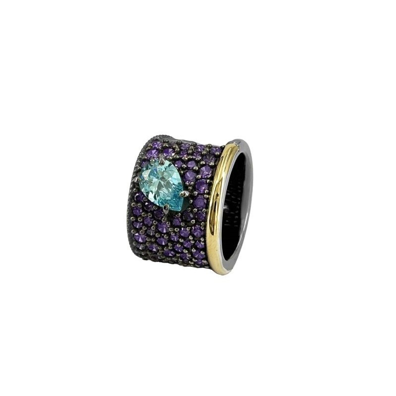 Descubre la colección “PUA” de BOHEMME, una línea de joyería moderna y sofisticada diseñada para la mujer actual. Este anillo está elaborada en plata rodiada en negro y oro de 18K, ofreciendo un estilo único y elegante. Destaca su piedra central en color topacio azul en forma de “púa”, rodeadas por un pavé de piedras color amatista, que aportan un toque de alegría y distinción. Perfectas para añadir un brillo especial a cualquier ocasión, las joyas de la colección “PUA” de BOHEMME combinan lo mejor de la tradición y la modernidad. ¡Descubre tu nueva joya favorita hoy mismo!