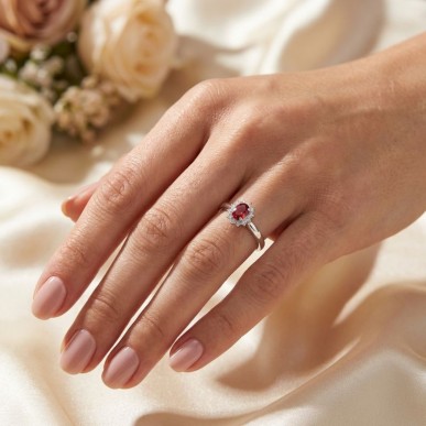 Modelo: Anillo con 1 rubi y 12 diamantes en Oro Blanco modelo rosetón.