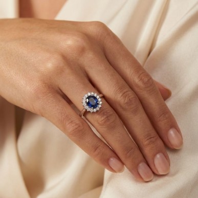 Anillo realizado en oro blanco de 18 quilates 750mls , con un zafiro azul ovalado de medida 7,8 x6,10 mm central de peso 1,70qts y una orla con 12 diamanes talla brillante con un total de 0,46 quilates. Tradición y modernidad se fusionan para crear una sortija que es todo luz.