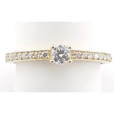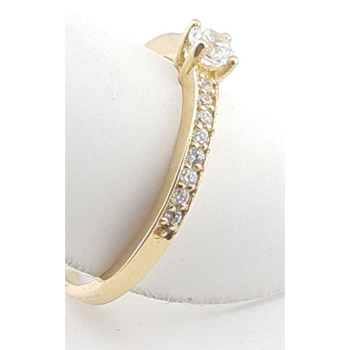 Anillo fabricado en oro amarillo de 1ª ley 18ktes 750mls , modelo solitario con montura plana lateral para engastar las piedras circonitas blancas . La piedra central es de 3.20mm de diámetro con montura de cuatro garras.Talla 14 tatum