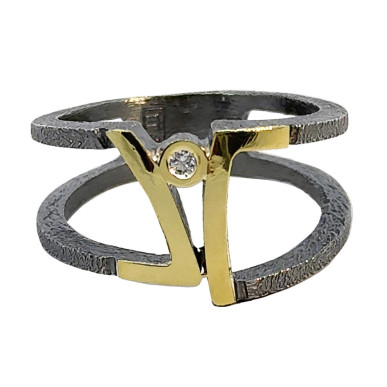 Anillo fabricado en plata de 1ª ley 925mls oxidada, oro de 18k 750mls pulido y brillante de 0.015ct.Luce como nadie los diseños de Miquel Sardá
