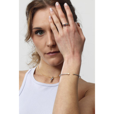 Anillo de brazo cerrado fabricado en plata 1ª ley 925mls rodiada con boca en oro de 18k 750mls y tanzanita. Perfecto para llevar solo o con la tendencia actual de combinar múltiples anillos.