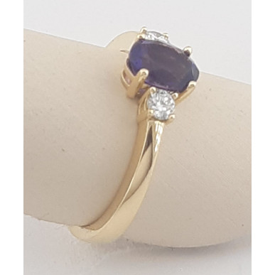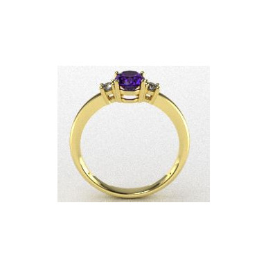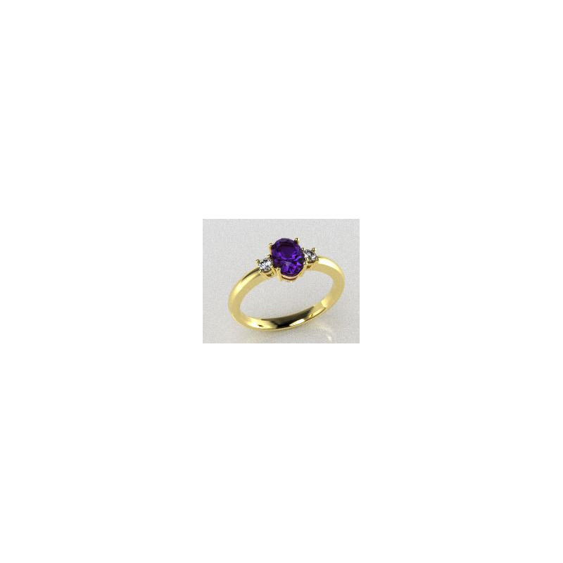 Anillo para mujer en oro amarillo 18ktes 750mls ,con piedra Amatista central de medida 7,00x5,00mm y con dos diamantes talla brillante con un peso total 0,16qtes, talla 14 tatum..
