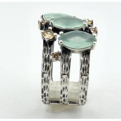 Anillo para mujer en plata de 1ª ley 925 mls de la marca Top Silver, anillo con aro de tres tiras con textura y con circonitas de colores verde y marrón .