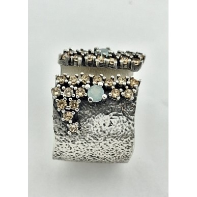 Anillo para mujer en plata de 1ª ley 925 mls de la marca Top Silver, anillo abierto por la parte central con textura y con cascada de piedras circonitas de colores verde y marrón .