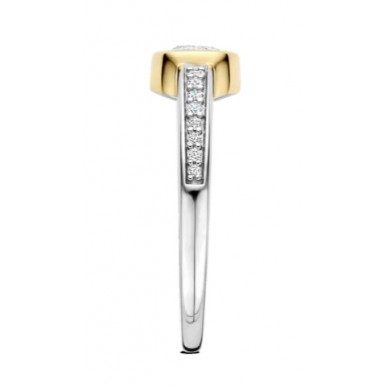 Añade una elegancia dorada con este anillo TI SENTO de plata bañada en oro 12390ZY. Elaborado en plata de ley 925, el anillo luce una circonita cúbica blanca de talla brillante en un bisel liso de oro amarillo, que permite que la piedra central destaque con una elegancia natural. La banda está engastada en pavé con brillantes piedras blancas a lo largo de cada hombro, ofreciendo un suave contraste y detalles refinados. Su forma atemporal y su acabado pulido en dos tonos lo convierten en un esencial versátil: llévalo solo o combínalo con otros anillos para un brillo excepcional. Sin níquel e hipoalergénico, este anillo ofrece un brillo duradero y comodidad para cualquier ocasión.