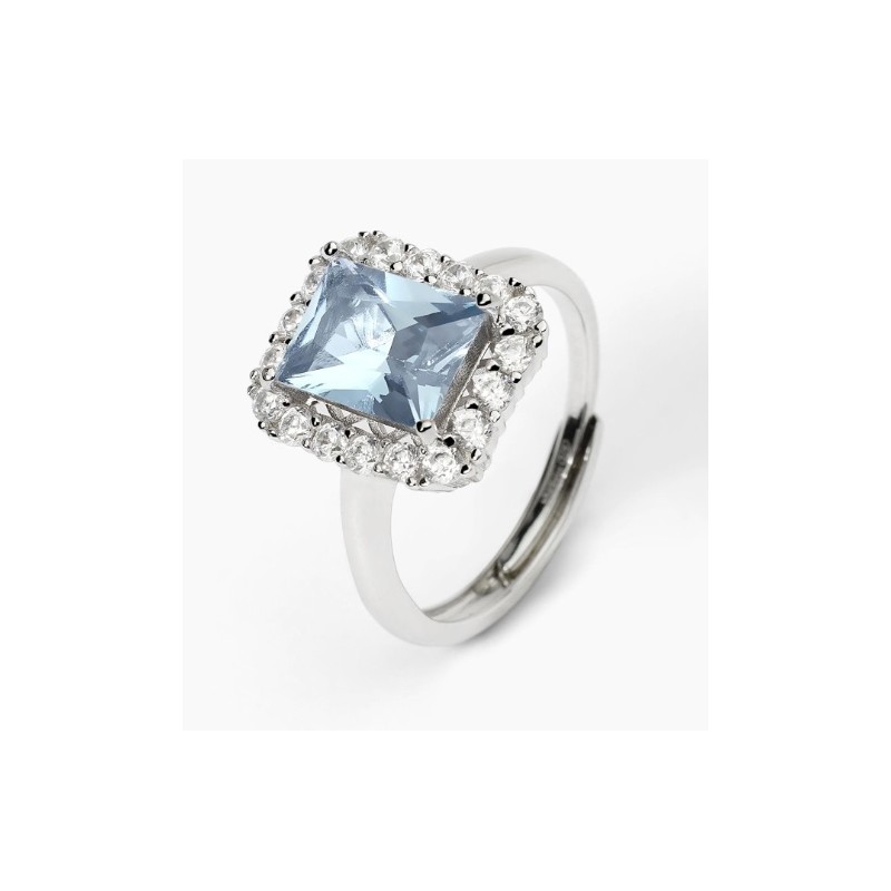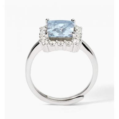 Descripción del Producto Anillo ajustable para mujer en plata rodiada con aguamarina sintética de talla princesa y circonita blanca. • Dimensiones de la aguamarina sintética: 7 x 9 mm • Diámetro de la circonita: 2 mm • Talla ajustable de la 11 a la 19 • Material: plata 925, aguamarina sintética, circonita