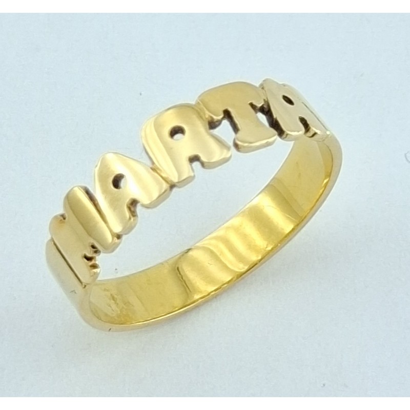 Anillo fabricado en oro amarillo de 18kilates 750mls , anillo con nombre Marta medida 4,50mm de ancho aro plano en definición a 3,30mm de ancho , talla 14 Tatum