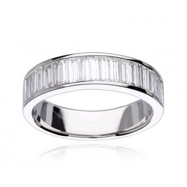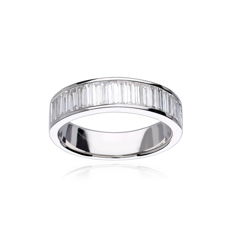 Anillo de compromiso fabricado en oro blanco 18k diamantes 0,77 cts: Fabricado en oro blanco de primera ley, con diamantes tallados en baguette engastados en carril, con 0.77 cts de peso total y color Blanco Wesselton H y pureza VS1. Acabado pulido.