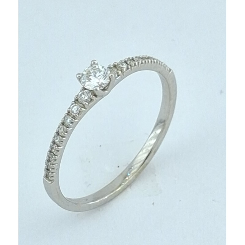 Características técnicas Modelo: Anillo en oro blanco 750mls y Diamantes Material: Oro blanco 750mls Piedra: 19 Diamantes talla brillante Peso diamante central: 0,12 quilates Peso 18 diamantes laterales: 0,09 quilates Color: G Pureza: VS Diámetro del diamante central: 3.07 mm Talla núm 14 Tatum Se entrega con certificado de Calidad