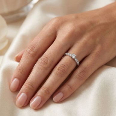 Cada uno de los 9 diamantes talla brillante ha sido seleccionado por su claridad y color, ofreciendo un brillo excepcional que acompaña y realza tu compromiso. El diamante central combinado con los laterales crea un balance perfecto de elegancia, sofisticación y simbolismo.
