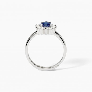 Anillo ajustable para mujer en plata rodiada con zafiro sintético de talla ovalada y circonita blanca. • Dimensiones del zafiro sintético: 5 x 7 mm • Diámetro de la circonita: 2 mm • Talla ajustable de la talla 11 a la 19 • Material: Plata 925, Zafiro sintético, Circonita