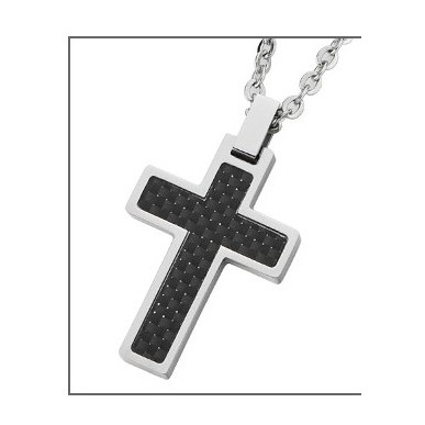 La cruz que mide 20 mm. de ancho, 28,5 mm. de largo y 3 mm. de grosor , con marco liso en acero y IP negro en el centro.