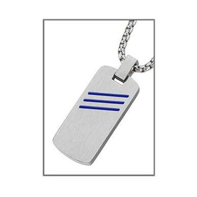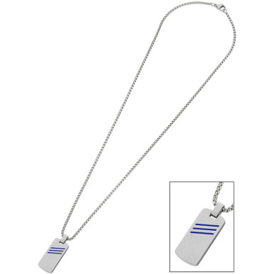 Collar tipo placa para hombre en acero , la cadena es de largo 50 + 5 cm con un grueso de 2,7 mm, la medida de la placa 12 mm de ancho 16 mm de largo y grueso de 3 mm. En la parte delantera de la placa con tres lineas en color azul. Grabación gratuita.