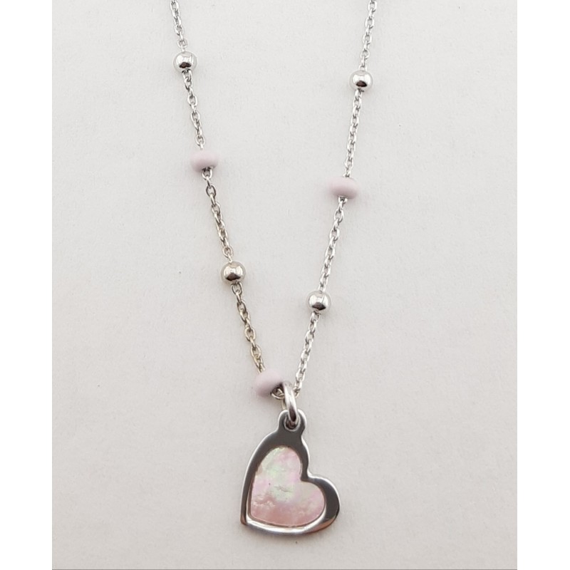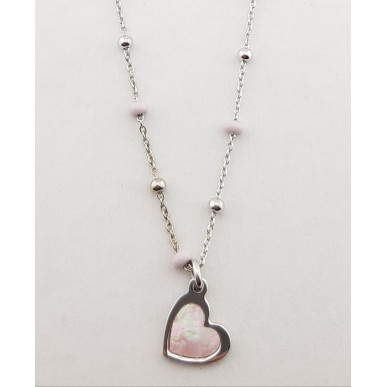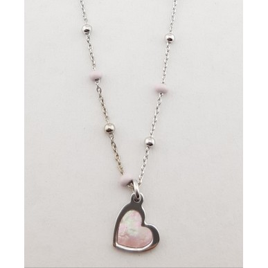 Collar con motivo en plata de 1ª ley 925 mls , cadena de bolas en plata y bolas pintadas a mano con esmalte natural.El motivo en nacar en color rosa y plata.