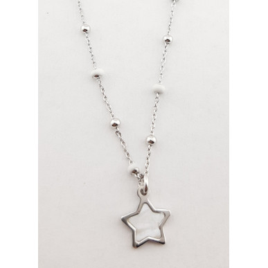 Collar con motivo en plata de 1ª ley 925 mls , cadena de bolas en plata y bolas pintadas a mano con esmalte natural.El motivo en nácar en color blanco y plata.