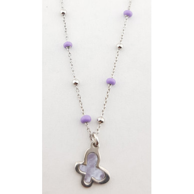 Collar con motivo en plata de 1ª ley 925 mls , cadena de bolas en plata y bolas pintadas a mano con esmalte natural.El motivo en nacar en color lila y plata.