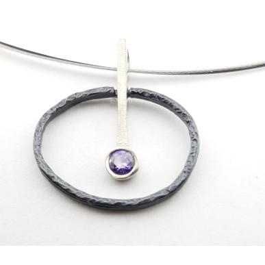 Collar para mujer en plata de 1ª ley 925 mls, collar en forma ovalo terminado en matizado martele y plata oxidada con una medida 31,00 x 27,50mm y parte central en plata matizada con una circonita de color amatista engastadas , incluido un collar con tres hilos de acero con cierre de mosquetón medida de largo 42 cm