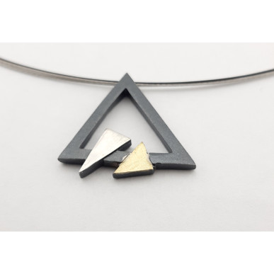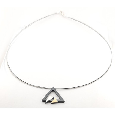 Collar para mujer en plata de 1ª ley 925 mls, colgante en forma geometrica en triangulos terminado en plata oxidada con un taque en oro de 1ª ley 750mls en un triangulo medida 21,00 x 23,00mm , incluido un collar con tres hilos de acero con cierre de mosquetón medida de largo 42 cm