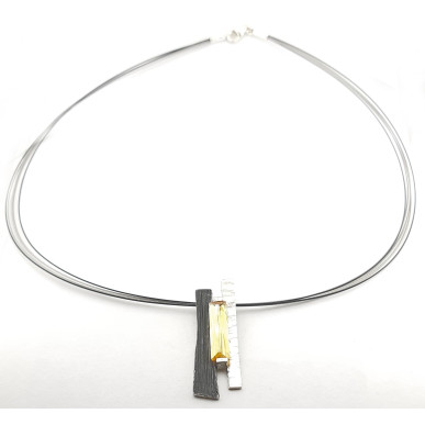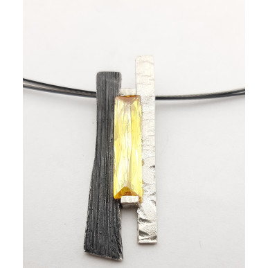Collar para mujer en plata de 1ª ley 925 mls, colgante terminado en matizado martele y plata oxidada , plata brillante con una medida 40,00 x 13,00mm y parte central con piedra citrino rectangular 19x5 mm , incluido un collar con cinco hilos de acero con cierre de mosquetón medida de largo 42 cm