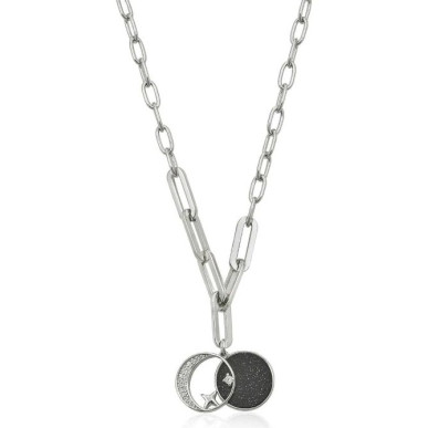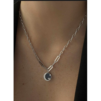 Collar para mujer con colgante pequeño de plata para mujer. Un diseño discreto de última tendencia perfecto para complementar tus looks. Colgantes pequeños de plata con cadenas paper clip en diferentes tamaños y doble motivo: una medalla en negro y una media luna. Perfecto para lucir junto a la pulsera a juego.