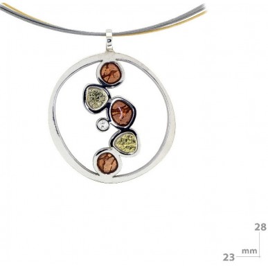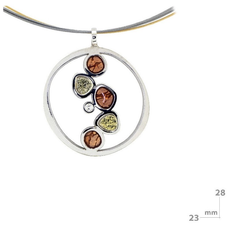 Colgante de 23mm de ancho por 28mm de alto fabricado en plata rodiada, oro de 18k, esmalte en frío y brillante de 0.015ct. Una joya moderna y muy original.