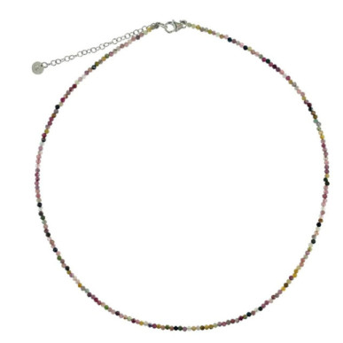 Collar con pequeñas bolitas facetadas de turmalina en verdes y rosas con cierre de mosquetón de plata. Incluye cadenita de alargo para adaptarlo mejor. Disponible la pulsera a juego.