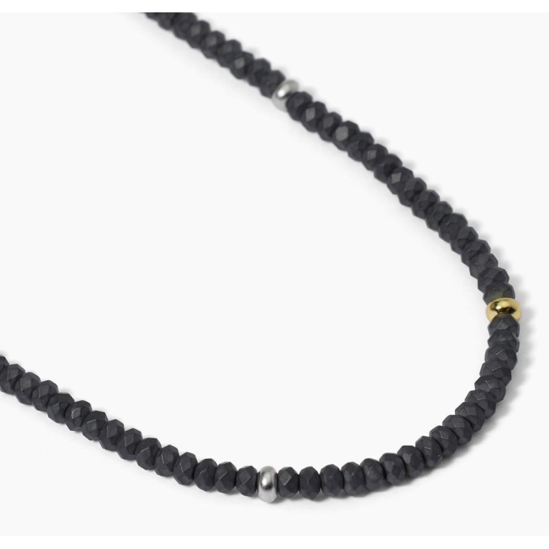 Collar para hombre en plata rodiada con inserciones bañadas en oro amarillo de 18k y esferas de hematites. • Tamaño ajustable, longitud de 45 a 50 cm • Dimensiones de la esfera de hematita: 3,3 mm • Cierre de mosquetón • Material: plata 925, hematita • Acabado: baño de oro de 18k