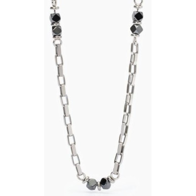 Collar de acero 316L con láminas de 3 mm de ancho y elementos de 11,5x4 mm con hematita cúbica gris facetada de 4x4 mm, longitud regulable de 45 a 50 cm