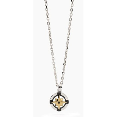 Collar de acero 316L con cadena tipo cable de 2 mm y collar de rosa de los vientos pulido con PVD dorado y barril de bronce de Ø 14 mm con cristal negro de Ø 1,5 mm, largo ajustable de 45 a 50 cm