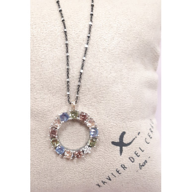 Collar para mujer fabricado en plata de 1ª ley 925 mls , orla con piedras calcedonia ,amatista verde ,peridoto fume , topacio azul , orla de 23,00 mm de diámetro , cadena en plata con baño de rutenio de largo total 40 cm