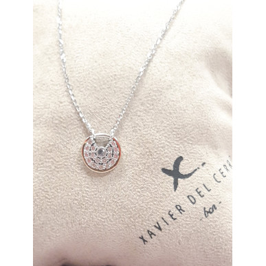 Collar para mujer fabricado en oro de 9 kt y plata de 925 mls , colgante redondo de medida 13,00 mm de diámetro con piedras circonita blanca y mini redondo con topacio blanco , cadena facetada en baño de rodio y de largo 40 cm con cierre de mosquetón.