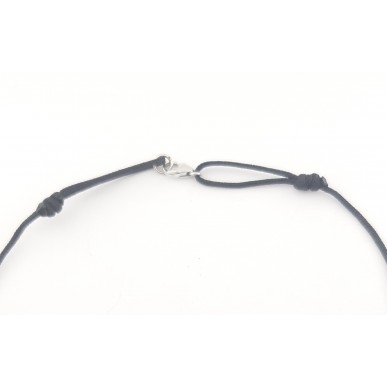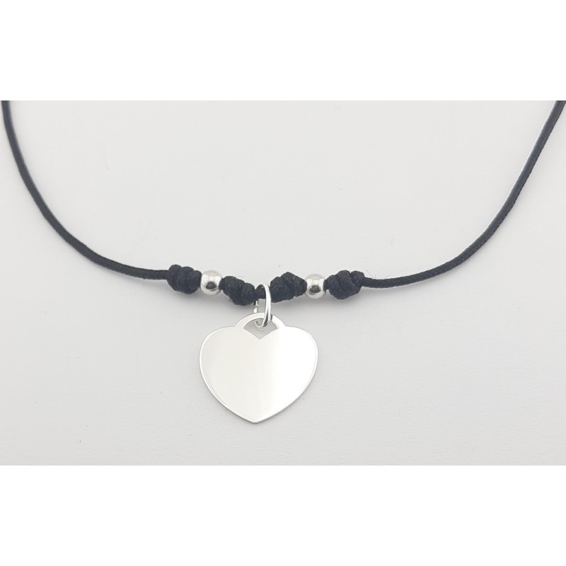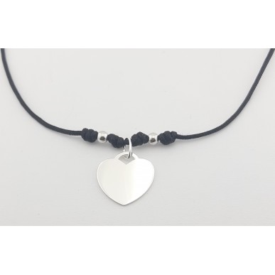 Collar con corazón en plata de 1ª ley 925mls montado con hilo marinero en color negro de 1,50mm ,2 bolas de plata de 4 mm de diámetro , ajustable la medida con nudos correderos y cierre de mosquetón. Medida del corazón 18,00x15,00mm.