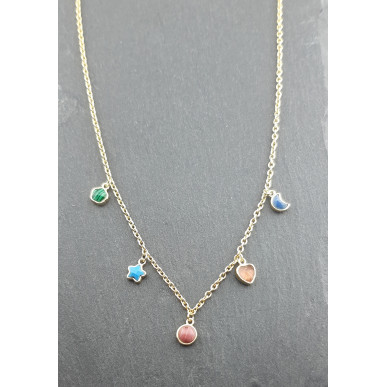 Collar de plata de 1ª ley 925mls con baño de oro amarillo de 18ktes con cinco abalorios de piedras naturales de colores , medida ajustable desde 40 a 43 cms.