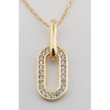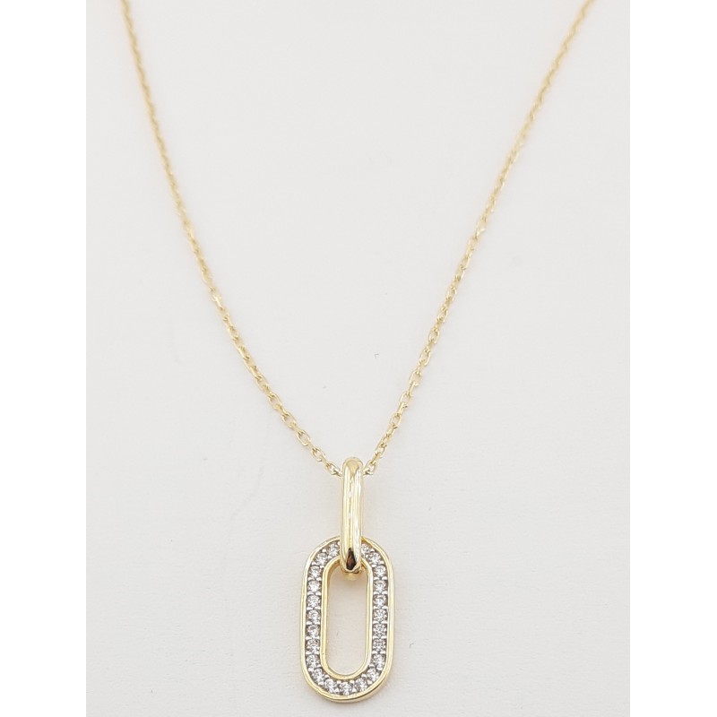 Cadena con colgante en oro amarillo de 1ª ley 18kts 750mls , cadena modelo forzada alargada de laro total 45cm , colgante con dos anillas ovaladas una con circonitas blancas medida del colgante 20,00mm alto 7,50mm ancho