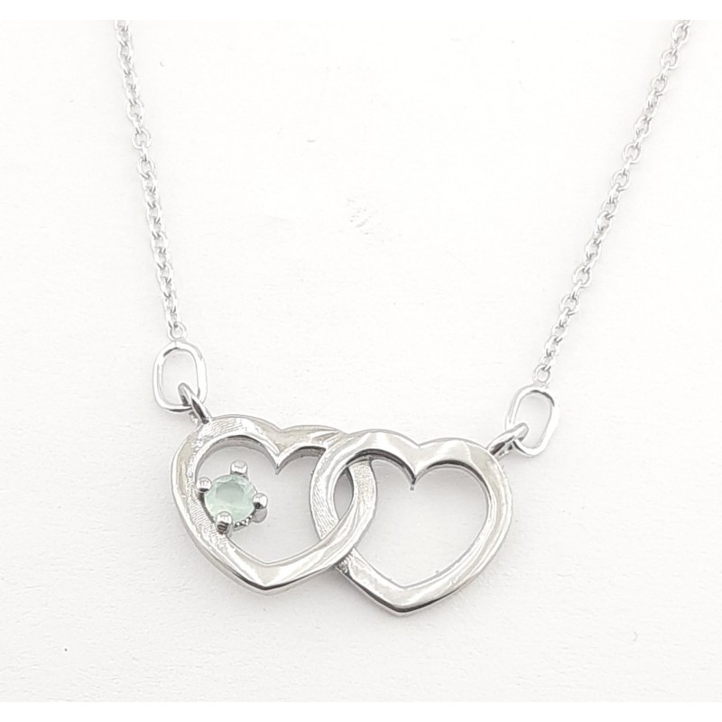 Collar en plara de 1ª ley 925mls , con dos corazones y con 1 piedra circonita de color, medida de los corazones 20x12mm, cadena de malla forzada de largo ajustable desde 38 a 43 cms.