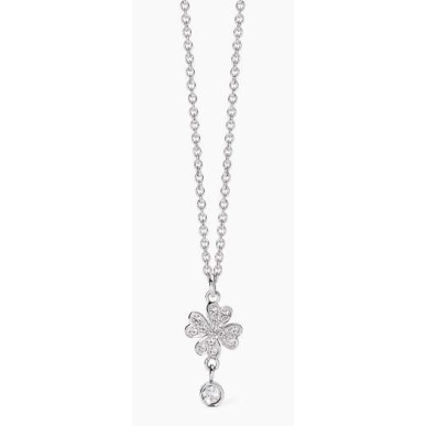 Collar de acero 316L con cadena de rodillos de 1,5 mm y colgante de 9,5x17 mm con triple de cuatro hojas de 9,5x9,5 mm y cristales de Ø 3 y 1,25 mm, largo ajustable de 40 a 45 cm