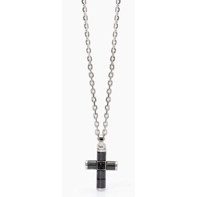Collar de acero 316L con cadena tipo cable de 2 mm y colgante de cruz de 14x18 mm con cerámica negra y cristal negro Ø 2,5 mm, largo ajustable de 45 a 50 cm
