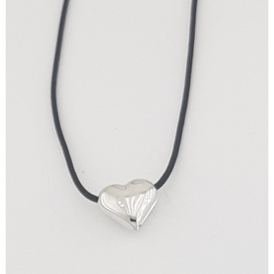Collar con corazón en plata de ley 925mls ,corazón medida 12x11x6mm , hilo de nylón en color negro terminado con nudos correderos.